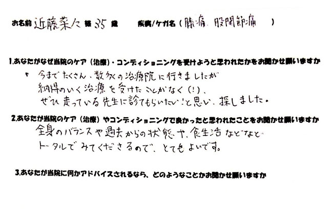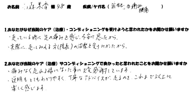 中高生部活動、市民ランナービギナー初心者から、サブ3~5、実業団選手における腰痛、股関節痛、坐骨神経痛、膝痛、腸脛靭帯炎、鵞足炎、シンスプリント、アキレス腱炎、足底腱膜炎、肉離れなどの治療実績があります