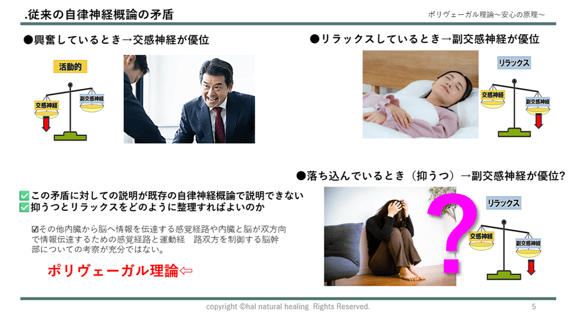 はじめに 従来の自律神経の理解は「交感神経」「副交感神経」という二分法が中心でした。しかしこの枠組みでは、例えば「抑うつ状態=副交感神経優位」と「リラックス=副交感神経優位」が同列になってしまい、理論的な矛盾が生じます。 「副交感神経=休息・安心」という単純な図式では、人のこころは説明しきれません。...