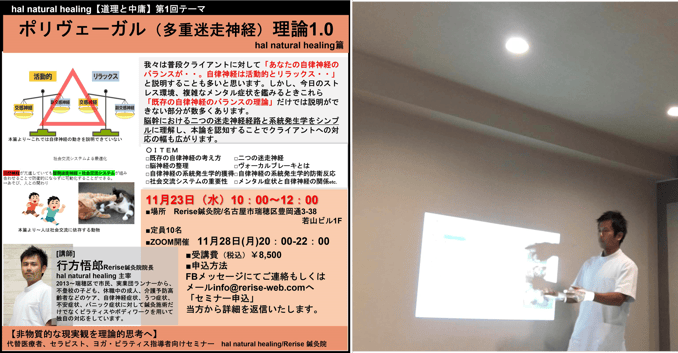 先日は自身主宰の『道理と中庸~hal natural healing』のセミナーを行いました。 主にトレーナー、インストラクター、セラピスト、代替医療者向けの内容となります。 第1回は「ポリヴェーガル理論1.0」・・・・。...
