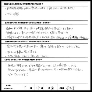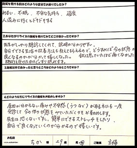 先生は怖くないですし、簡単にできるストレッチをしたり、自分で良くなっていくが分かるので嬉しいです。