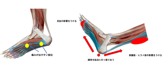 → アキレス腱を介して踵骨を強く牽引し、足底腱膜の張力が増大。 -
