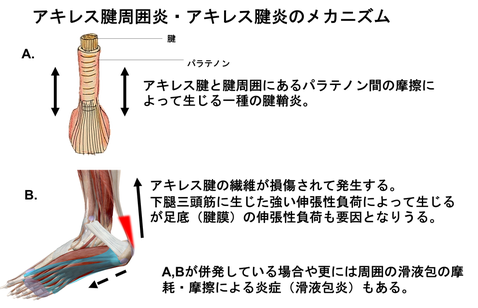 そもそもアキレス腱炎は腱自体の微細断裂、腱周囲の組織の変性、踵骨後部滑液包の炎症などいくつかの要因により痛みがが発生していますし、混在することもあります。