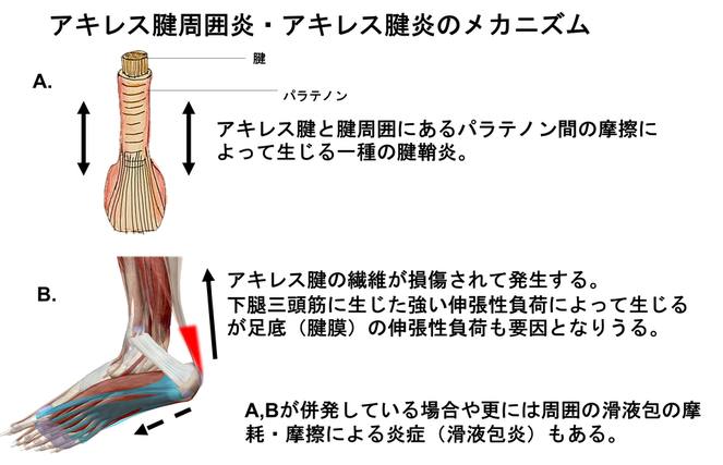 ①アキレス腱と周囲にあるパラテノンという鞘の摩擦によって生じる痛み