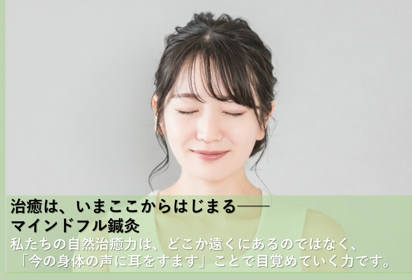 マインドフル鍼灸は、単なる対症療法ではなく、“いま・ここ・わたし”という根源的な感覚に戻ることで心と身体をゆっくりと整えていく、あたたかなプロセスです。