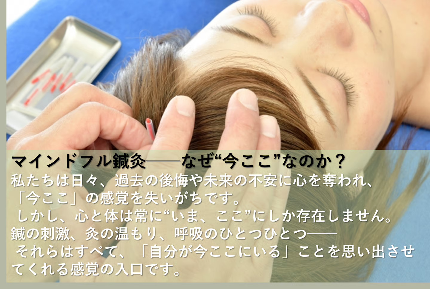 マインドフル鍼灸は、東洋医学の鍼灸とマインドフルネスの原理を融合させた、新しい癒しのアプローチです。 ただ“治す”のではなく、今ここにいるあなた自身の感覚に、もう一度つながるためのセラピーです。